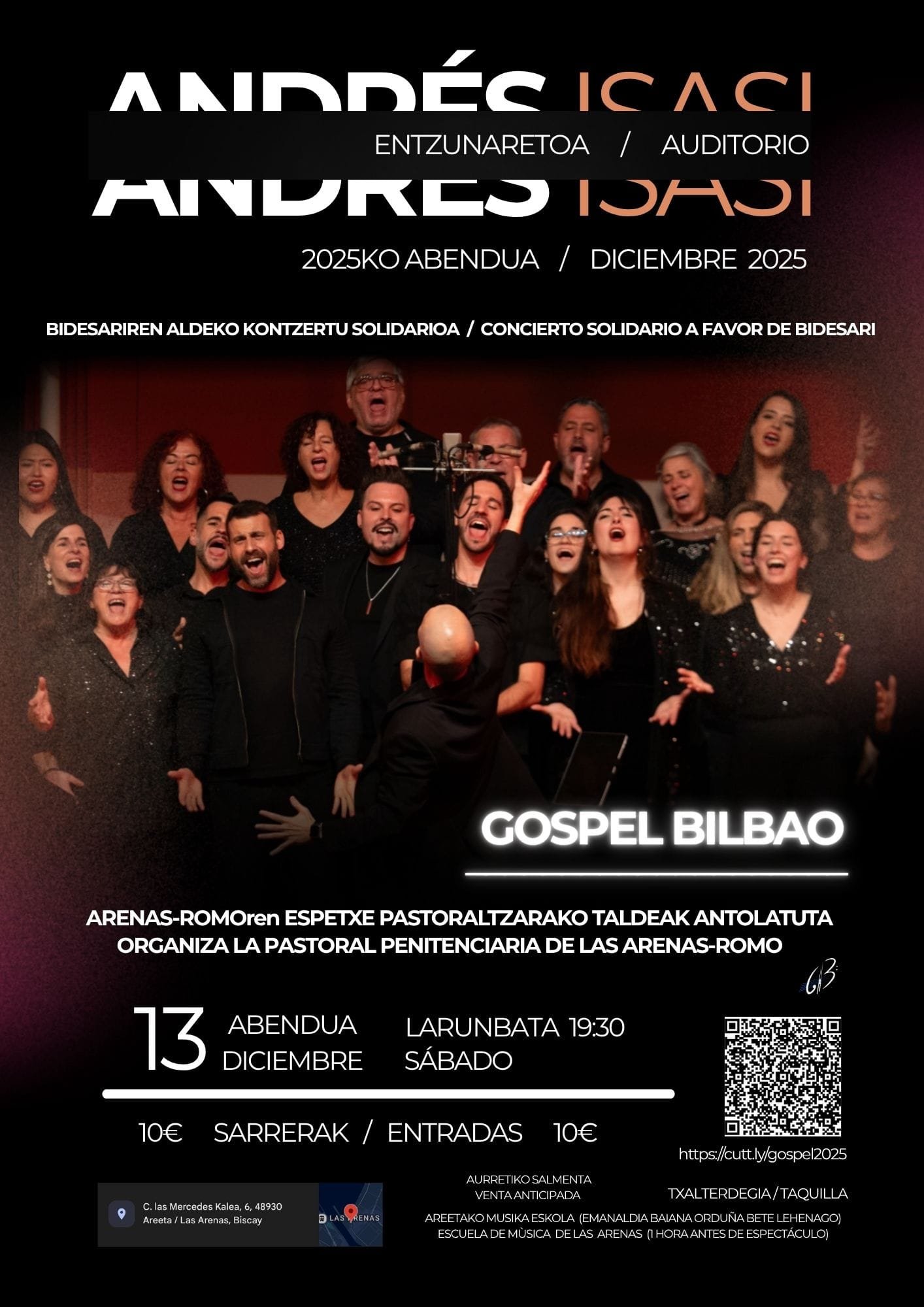 - Gospel kontzertua Bidesariren alde: datorren abenduaren 13an, larunbata, arratsaldeko 19:30etan, Andres Isasin ongintzazko kontzertua eskainiko da Bidesari presoen gizarteratzearen aldeko elizbarrutiko elkartearen alde.
